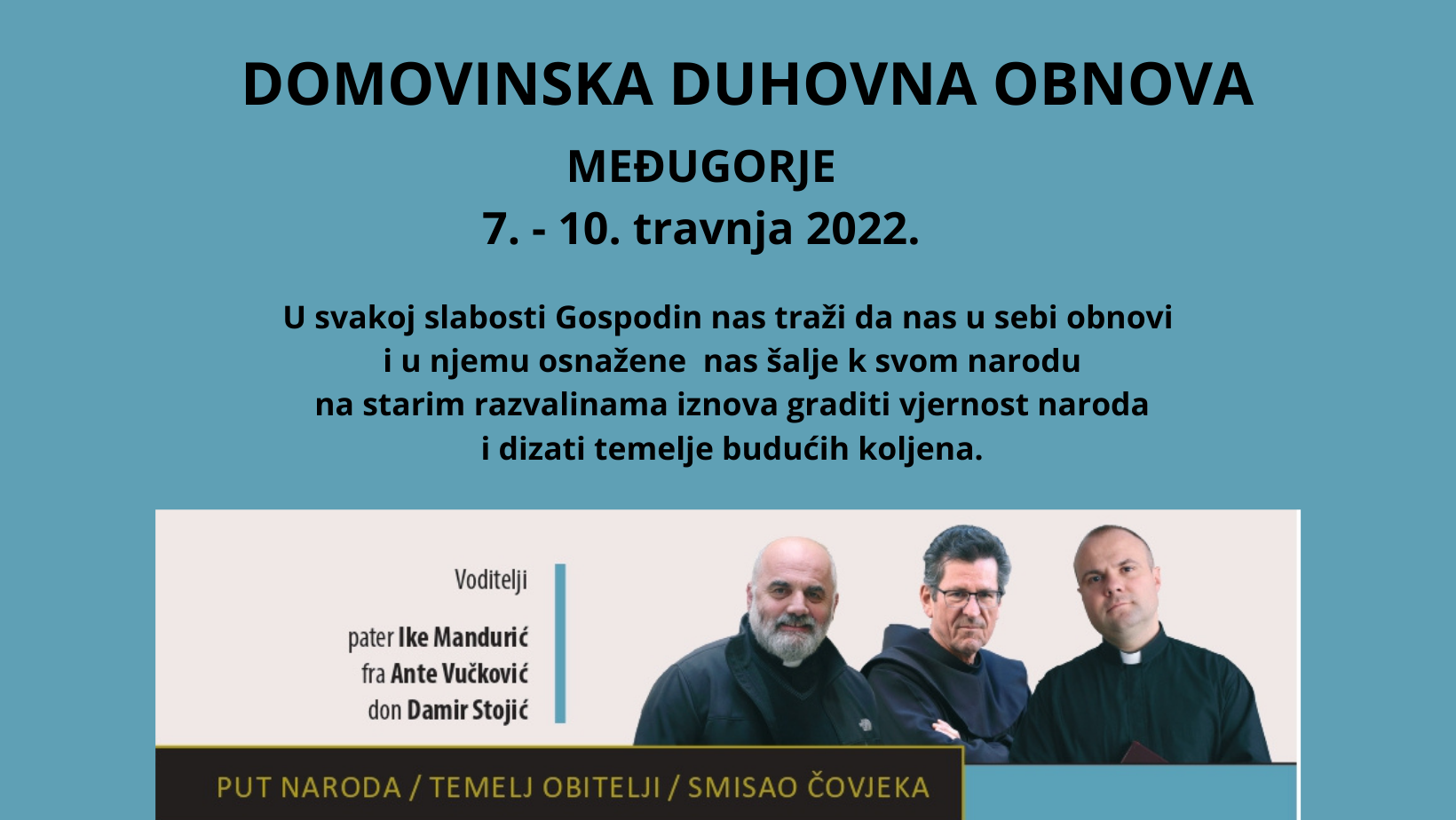Duhovnu obnovu će voditi poznati i ugledni svećenici: pater Ike Mandurić, fra Ante Vučković i don Damir Stojić. Sastojat će se od nagovora, svetih misa, pohoda svetim mjestima te prigoda za osobne razgovore sa svećenikom i ispovijed.